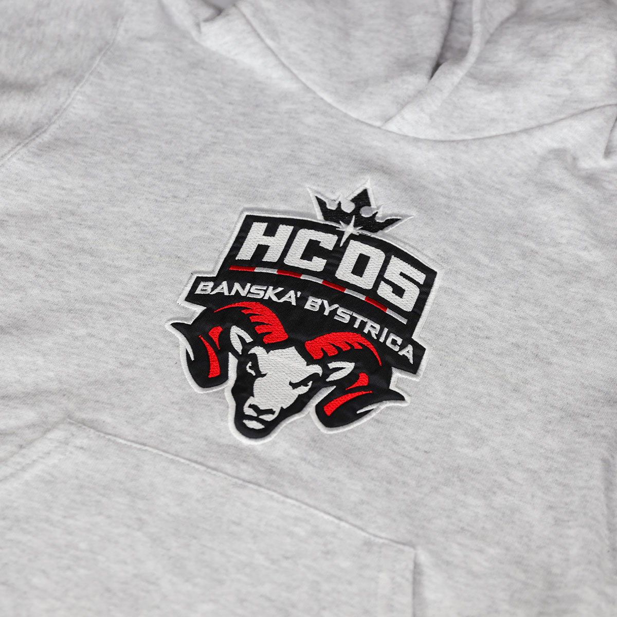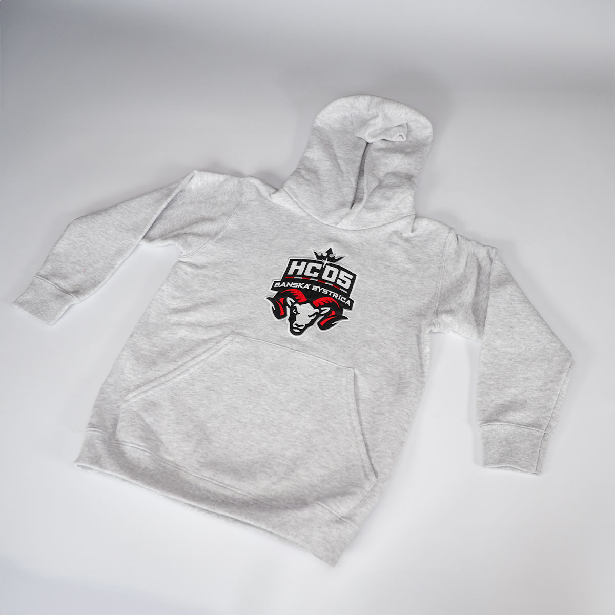 80% bavlna, 20% polyester, kapucňa bez šnúrky, vpredu vrecko, na hrudi znak HC ’05