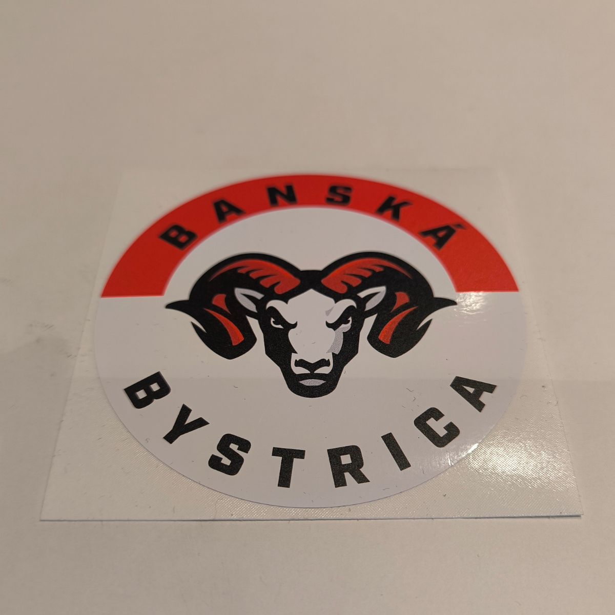 PVC nálepka s okrúhlym logom HC ’05 Banská Bystrica v červeno-bielom farebnom prevedení.