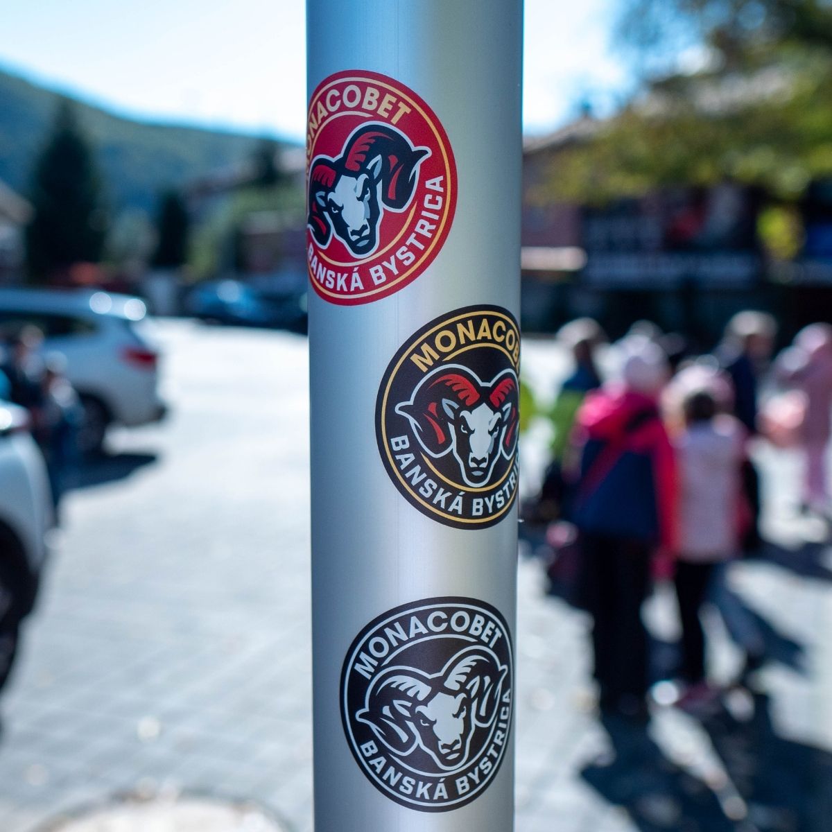 Nálepka s logom HC MONACObet Banská Bystrica v troch rôznych farebných prevedeniach.